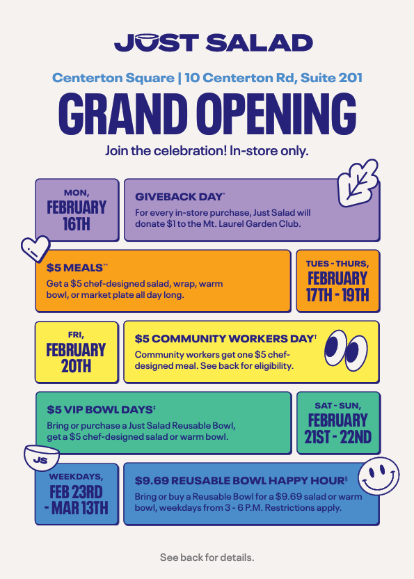 - Monday, February 16, 2026: Giveback Day! For every in-store purchase, Just Salad will donate $1 to the Mt. Laurel Garden Club.