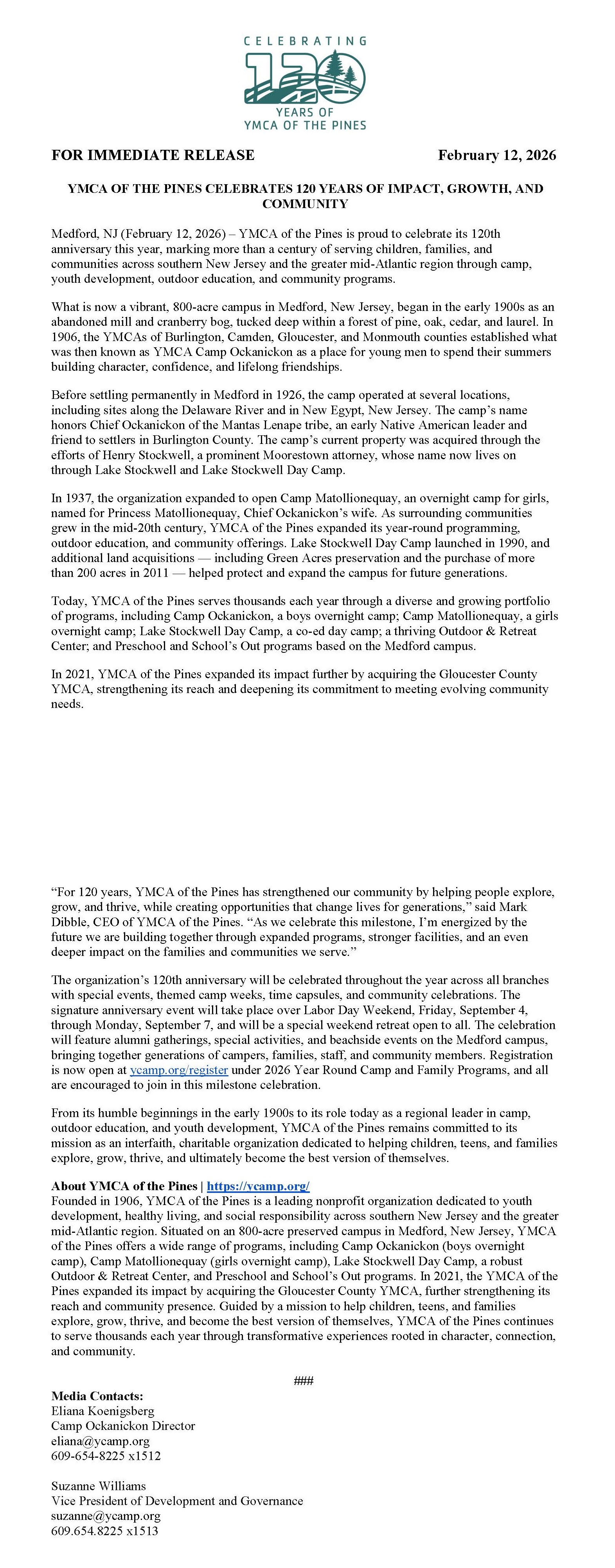 Press Release: YMCA of the Pines Celebrates 120 Years of Impact, Growth, and Community